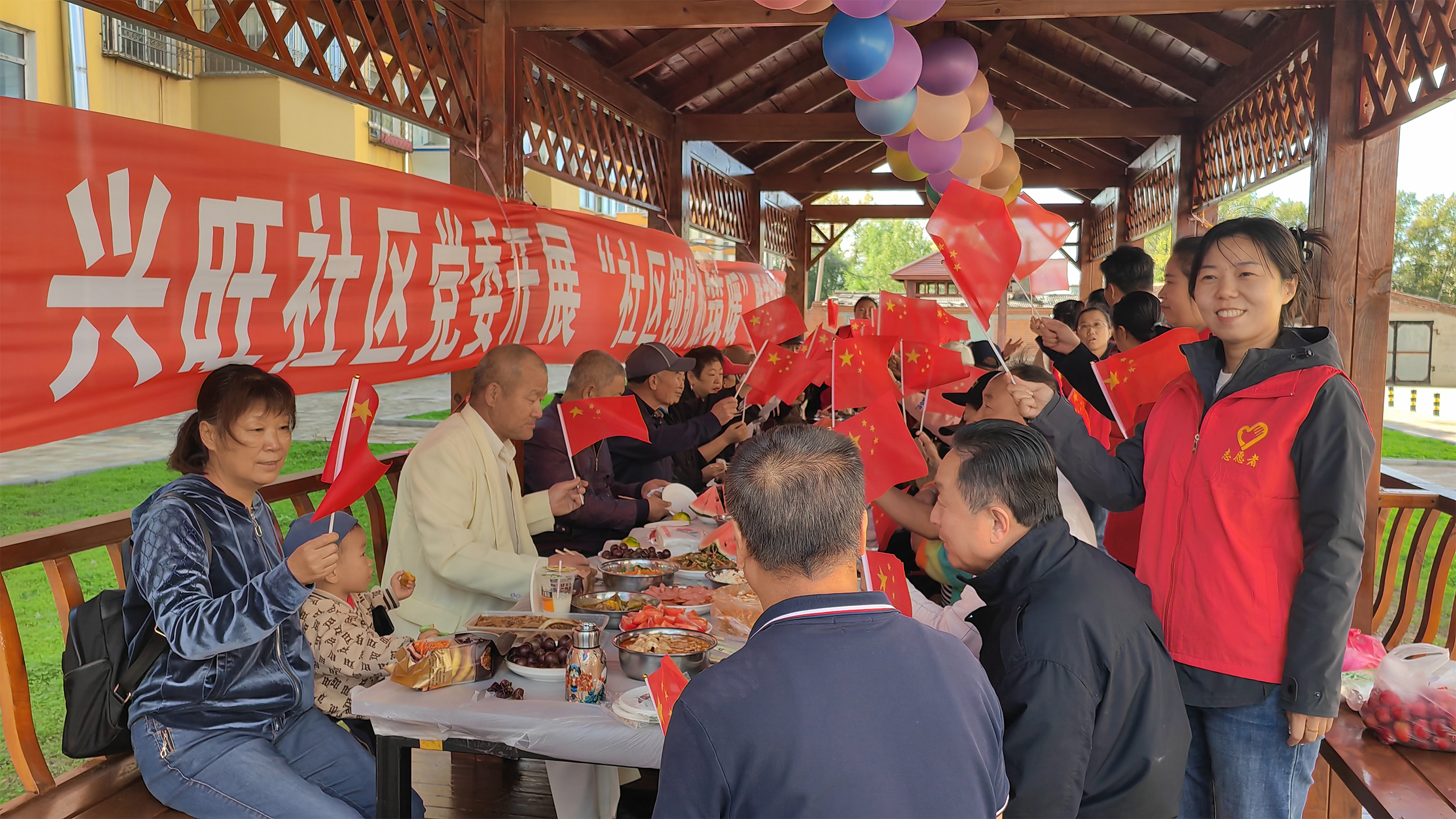 活動當天,居民們帶著精心烹制的菜肴來到現場,社區還貼心準備了特色鐵鍋燉、水果、月餅和飲品,大家手持國旗,共同唱響《我和我的祖國》,歌聲中既有對祖國的祝福,也飽含共創美好生活的信念。大家圍坐在一起,品美味,嘮家常,“煙火氣”中洋溢著融洽和諧的氛圍。